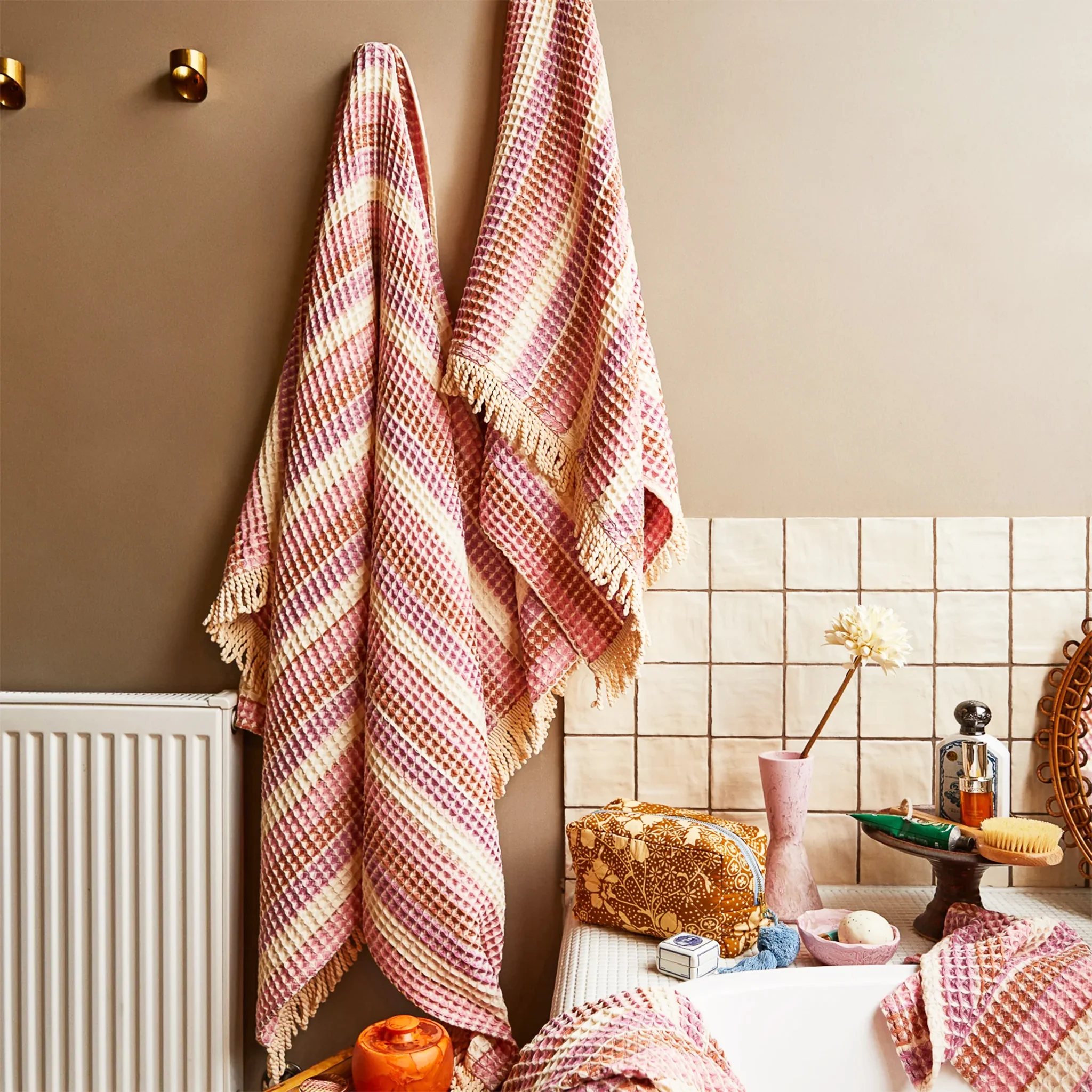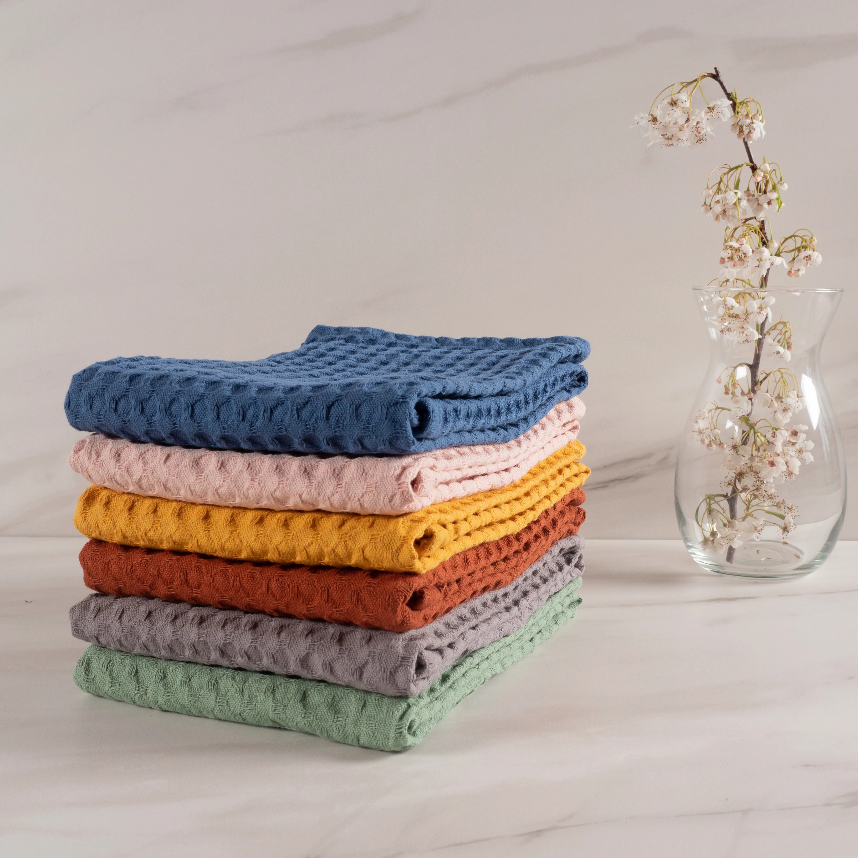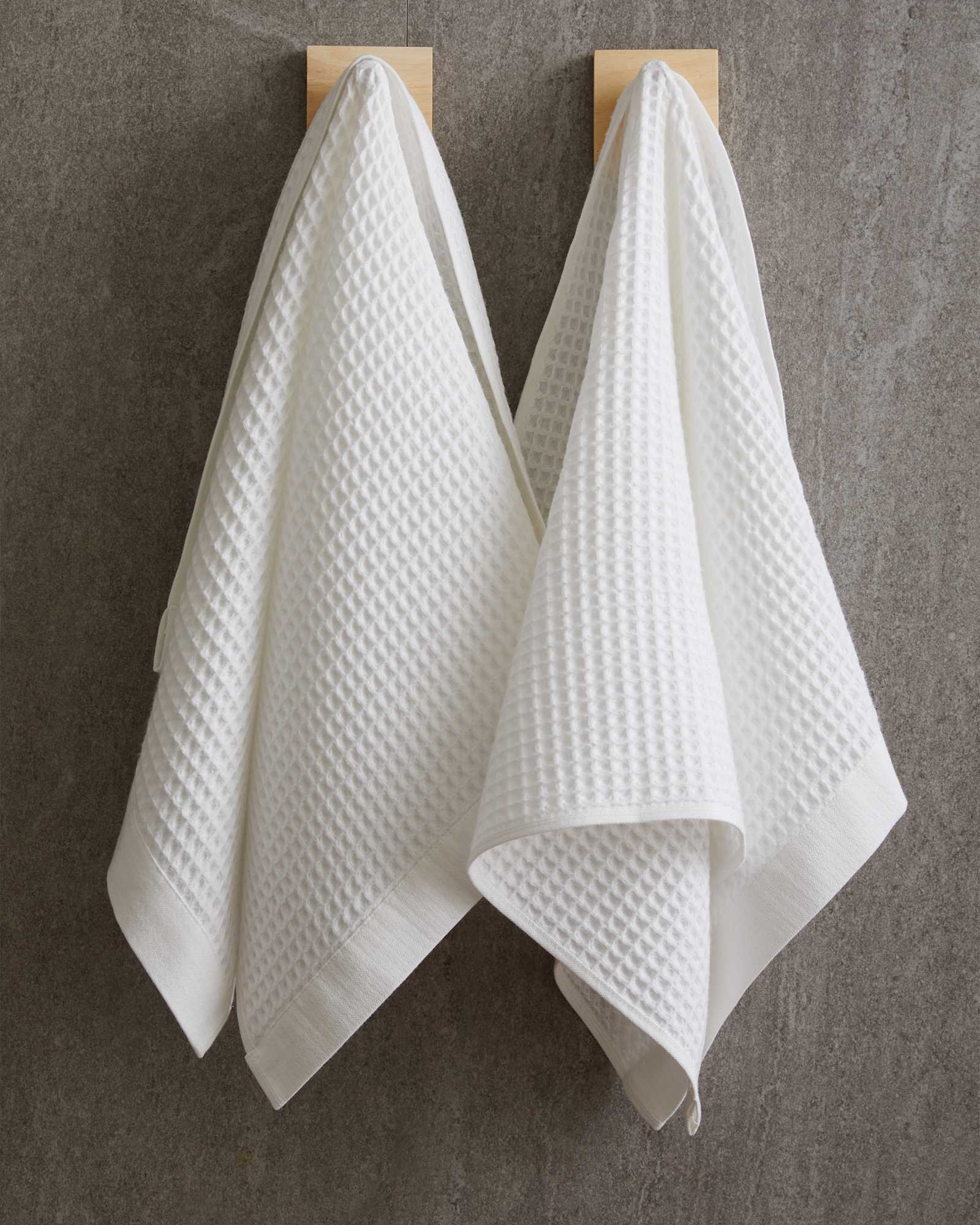 Waffle towels with a textured weave, designed to be lightweight, quick-drying, and stylish in your bath space.